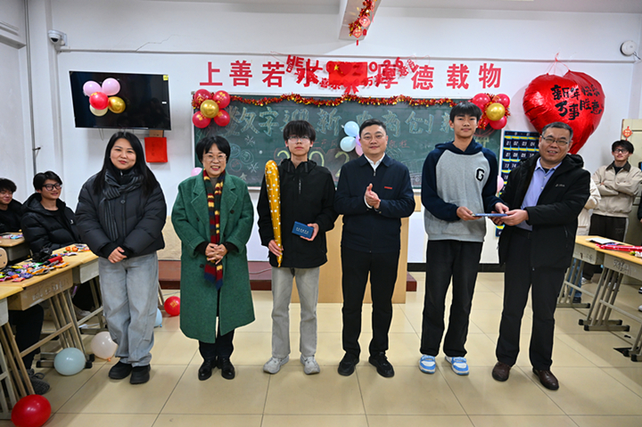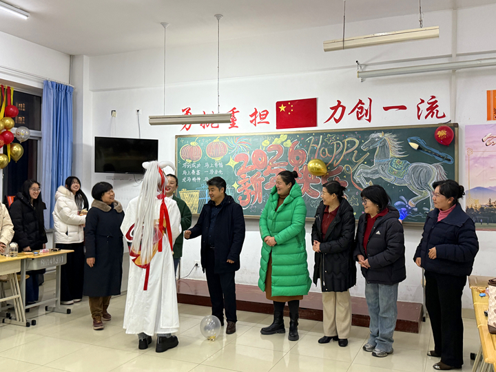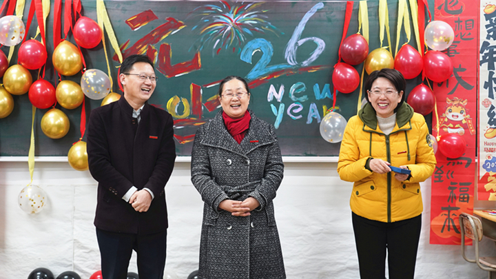 翟明戈(右三)将满载祝福的小礼物送到同学手中同学们的活力与热情感染了张秀芳(中)和老师们,灿烂的笑容里,藏着师生同庆新年的欢喜