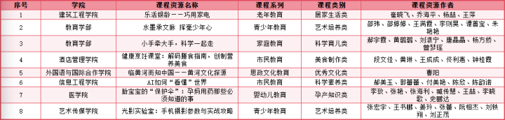 此次入选的课程资源主题鲜明、内容实用,紧密贴合社区居民的学习与生活需求,涵盖老年教育、青少年教育、家庭教育、市民教育、孕产知识、科学素养及艺术培养等多个领域,是学校服务终身学习、赋能社区发展的成果。具体名单如下: