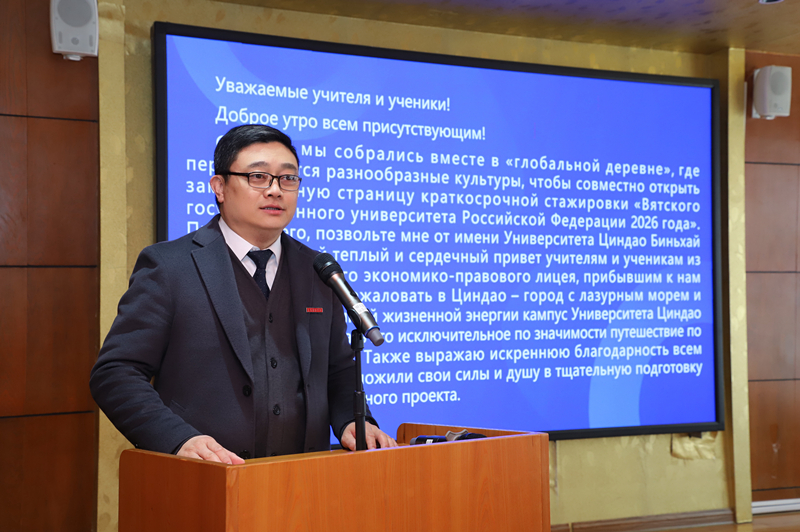 俄罗斯维亚特卡国立大学、基洛夫经济法律高级中学的学生代表乌利亚娜·什切皮娜与阿列西娅·克罗希金娜先后登台发言,真挚分享对此次交流的期待与憧憬,同时对活动主办方青岛滨海学院的周到安排与鼎力支持致以诚挚感谢,期待在此次交流中收获知识并结下友谊。